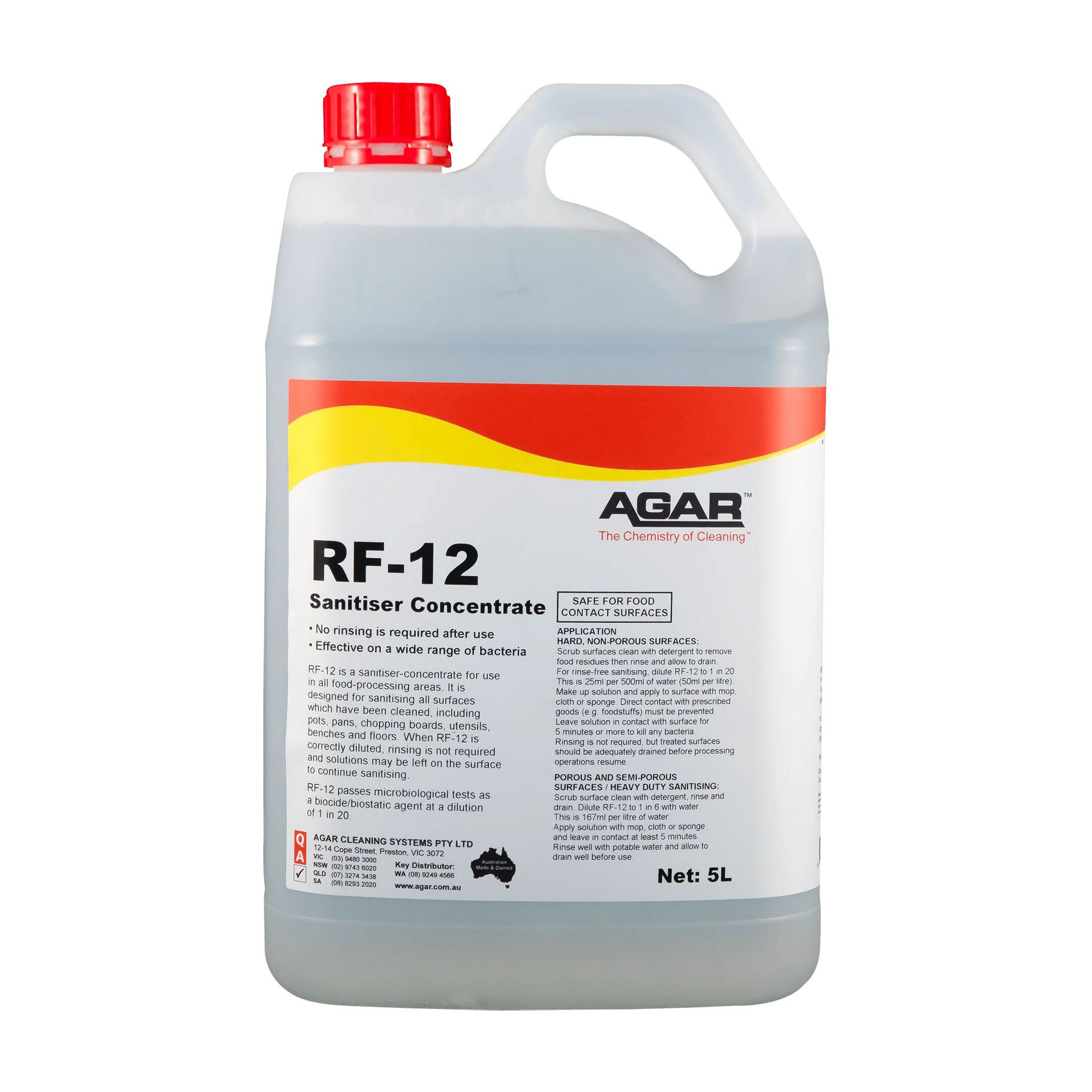 RF-12 is a sanitiser concentrate for use in all food processing areas. When correctly diluted, RF-12 solutions do not need to be rinsed off.